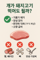 개가 돼지고기 먹어도 될까? 가능: 완전히 익힌(내부 71℃ 이상) 순수 돼지고기라면 소량 급여 가능. 불가/주의: 생고기, 양념·가공육, 뼈, 과도한 지방은 금지 또는 위험. 반드시 지켜야 할 6가지 완전가열 기생충(예: 트리키넬라)·세균 위험 때문에 생/레어 금지. 삶기·찜·에어프라이/오븐으로 속까지 하얗게 익히기(분홍색 X). 양념 금지 간장, 소금, 마늘·양파·대파, 고춧가루, 설탕, 술 → 독성·염분 과다. 삼겹살/보쌈용 양념·장아찌·쌈장·김치 묻은 고기는 주지 않기. 지방 제거 비계는 췌장염 위험↑. **앞다리살·등심 등 기름기 적은 부위로, 눈에 보이는 지방은 최대한 제거. 가공육 NO 햄, 베이컨, 소시지는 염분·아질산염이 많아 금지. 뼈 금지 익힌 돼지뼈는 잘게 부서져 식도·장 천공 위험. 생뼈도 세균·치아손상 위험. 양 조절 간식은 하루 열량의 ≤10% 원칙. 처음엔 체중 1kg당 5~8g 정도로 소량 테스트 후 반응 확인. 급여 방법 (예시) 준비: 지방 제거한 앞다리살 50~80g(중형견 기준), 물만 넣고 완전가열 → 한입 크기로 찢기. 혼합: 사료 위 토퍼로 소량 뿌리거나 채소(단호박·브로콜리 소량)와 함께. 보관: 1~2일분만 냉장, 2일 이내 소진. 나머진 1회분씩 냉동. 먹이면 안 되는 경우 췌장염 병력/의심, 비만, 만성 위장질환, 고지혈증 식이 알레르기(돼지고기에 반응하는 개체 존재) 강아지 초초기 위장 예민기나 수술/질병 회복기에는 수의사와 상의 이상 반응 체크리스트 24~48시간 내 구토, 설사, 복통(등말림/배만지면 싫어함), 무기력 → 즉시 급여 중단하고 수의사 문의. 한눈 요약 표 ✅ 가능: 기름기 제거 + 무염 + 완전가열한 순수 돼지고기 소량 ⚠️ 주의: 처음 급여, 노령/기저질환, 체중 관리 중 ❌ 금지: 생고기, 양념/가공육(햄·베이컨·소시지), 뼈, 비계 덩어리 한 줄 결론: “살코기만, 양념 없이, 완전히 익혀, 조금만”이면 OK.